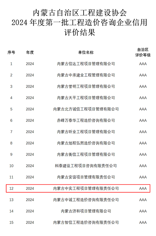 2024-07-3014459 次近期,我公司参加内蒙古自治区工程建设协会组织的“2024年度第一批工程造价咨询企业信用”申报,获得“信用AAA级证书”。我公司成立多年以来,遵循中国工程造价管理协会对造价咨询企…